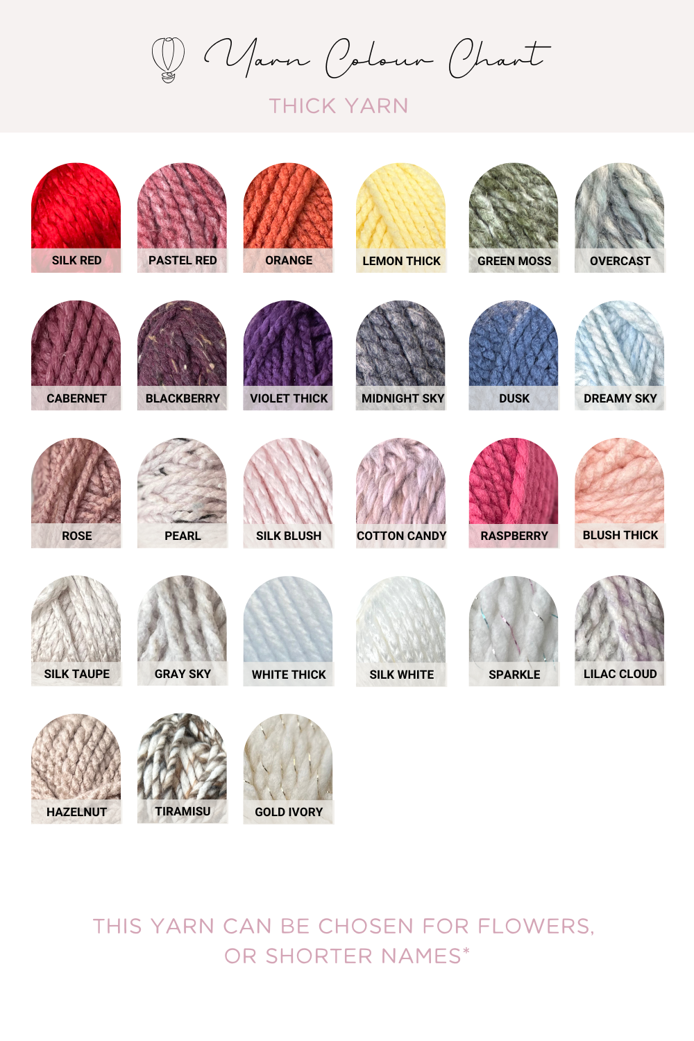 (ex.: Name + Design: Kaela, Mauve yarn. Flowers: blush/white with Mauve centre)